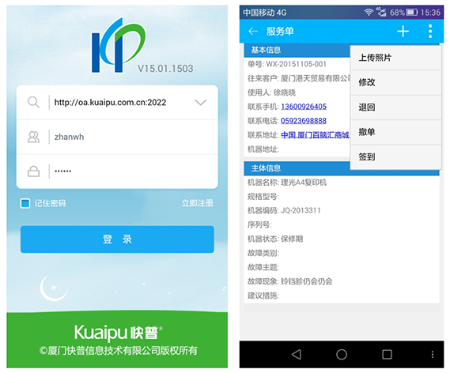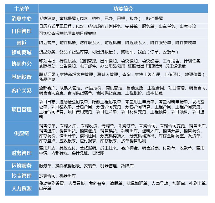 移動服務(wù)接單、機(jī)器二維碼掃描、手機(jī)拍照定位、機(jī)器新增查詢、耗材查詢、客戶新增查詢、實(shí)時(shí)庫存查詢、知識庫查詢、應(yīng)收款及對帳、移動辦公及審批等;