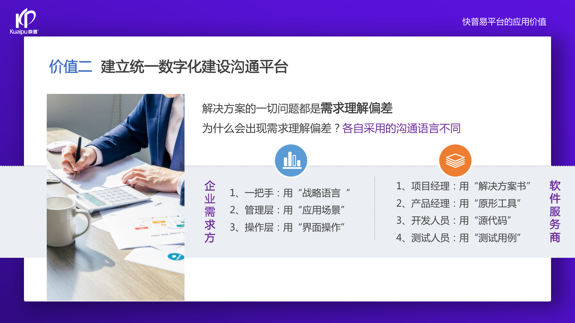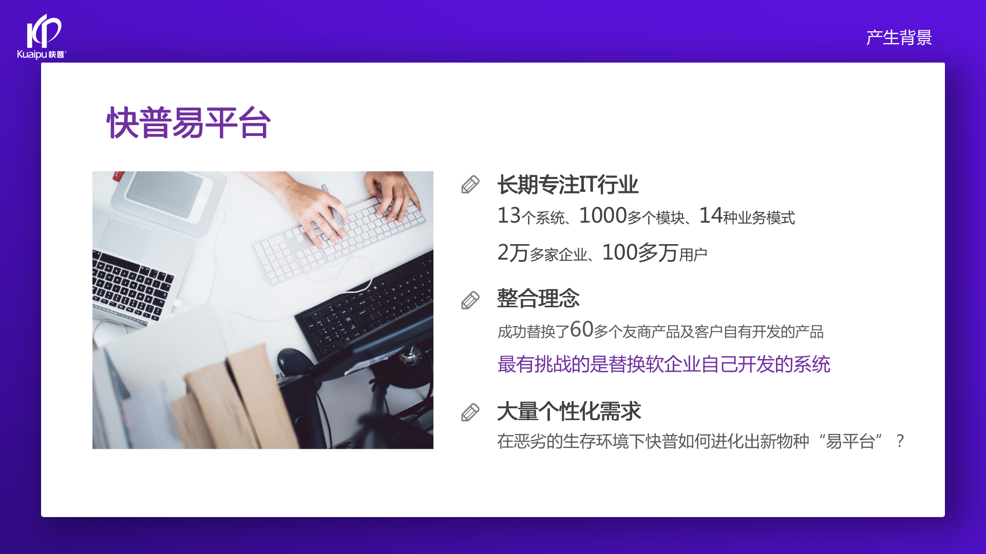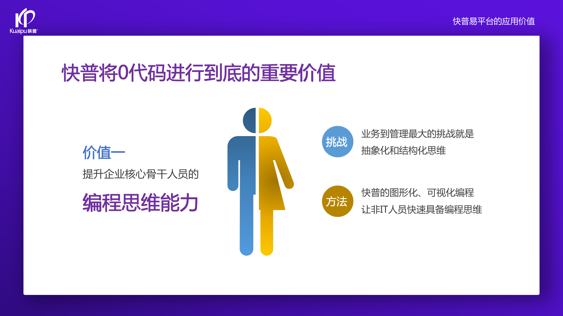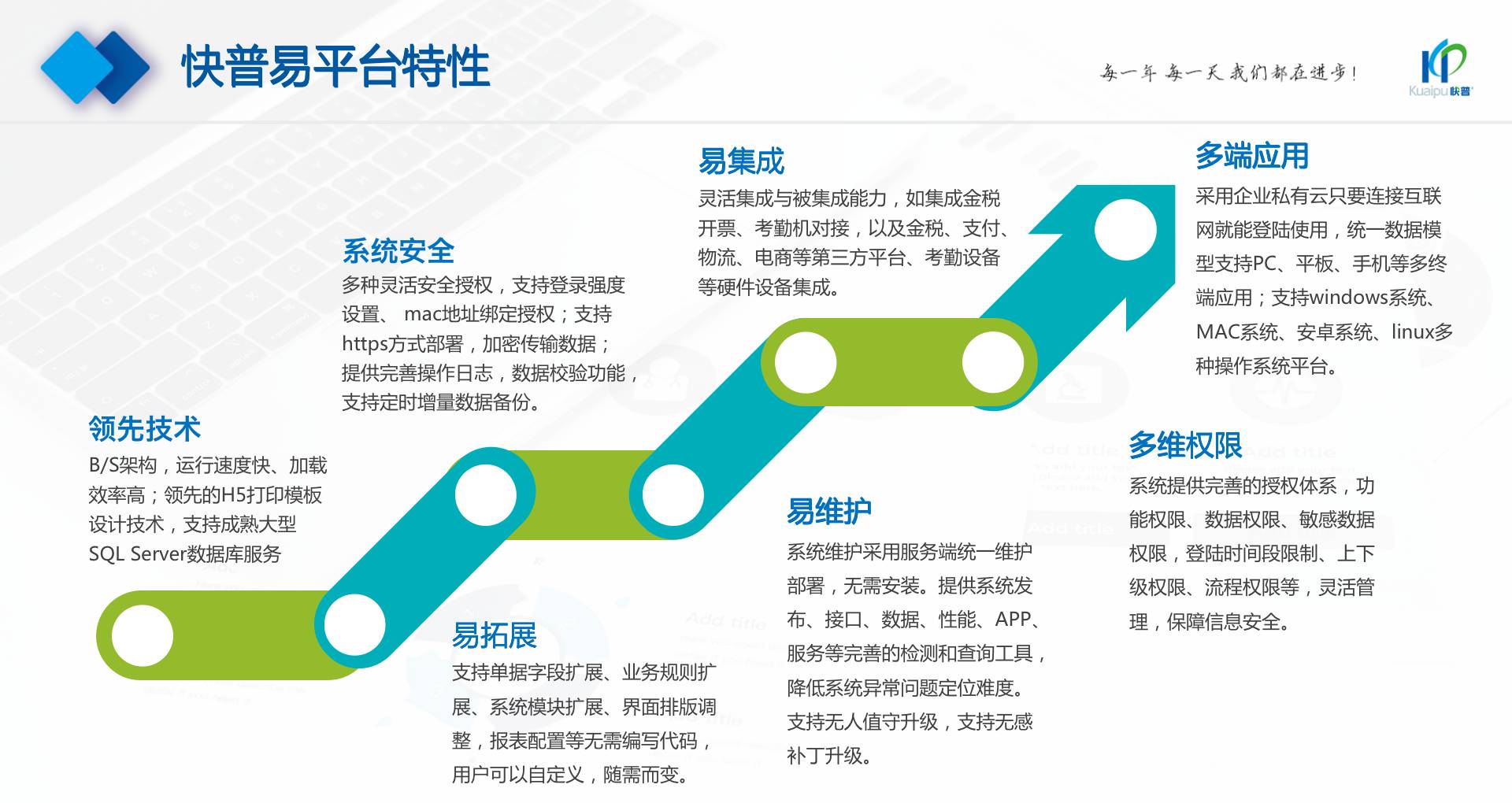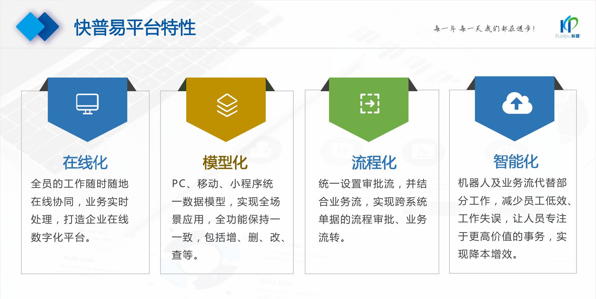 為了解決市場需求與平臺(tái)產(chǎn)品瓶頸等矛盾,實(shí)現(xiàn)徹底的零代碼平臺(tái),快普堅(jiān)持理念創(chuàng)新,以理念推動(dòng)平臺(tái)技術(shù)的創(chuàng)新?!耙圆蛔儜?yīng)萬變”的理念:分析哪些東西未來肯定不變?哪些趨勢未來一定會(huì)變?從變化中找出不變的因素,從不變中找出變動(dòng)的因素;從量變到質(zhì)變,經(jīng)歷萬變總結(jié)抽象出不變的本質(zhì)。基于快普長期的信息化服務(wù)經(jīng)驗(yàn),開發(fā)配置出企業(yè)數(shù)字化轉(zhuǎn)型工具:快普易平臺(tái)成功解決了企業(yè)數(shù)字化轉(zhuǎn)型升級(jí)面臨的客戶大量個(gè)性化需求,真正實(shí)現(xiàn)隨需而變的設(shè)計(jì)理念,大大降低了信息化投入成本,提高信息化效率,幫助企業(yè)實(shí)現(xiàn)自主可控的技術(shù)創(chuàng)新,從而進(jìn)一步推動(dòng)企業(yè)的業(yè)務(wù)創(chuàng)新和管理創(chuàng)新。