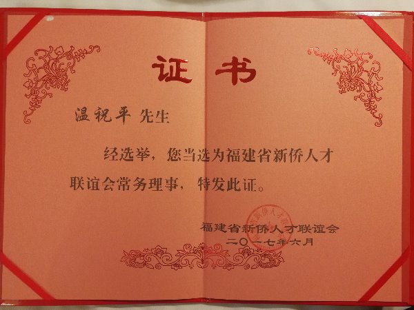 快普董事長(zhǎng)溫祝平作為中國(guó)企業(yè)管理專(zhuān)家應(yīng)邀出席會(huì)議,并當(dāng)選為福建省新僑人才聯(lián)誼會(huì)常務(wù)理事。