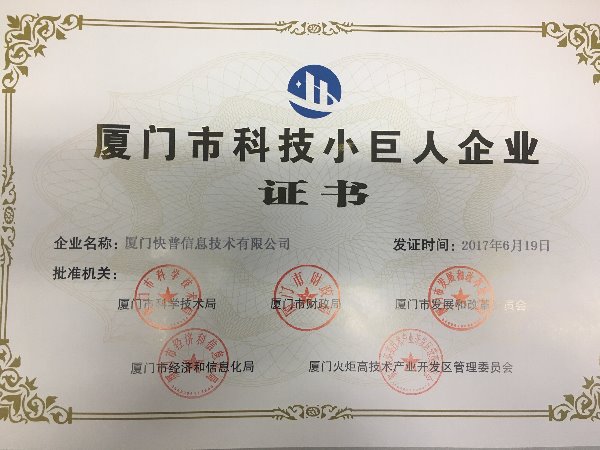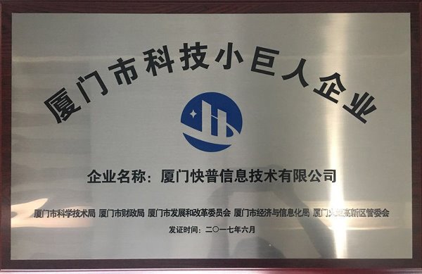 近日,福建省科技廳公布2017年科技小巨人企業(yè)名單,廈門(mén)快普信息技術(shù)有限公司憑借自身的卓越實(shí)力,在激烈競(jìng)爭(zhēng)中脫穎而出,被授予2017年“廈門(mén)市科技小巨人企業(yè)“榮譽(yù)稱(chēng)號(hào)。