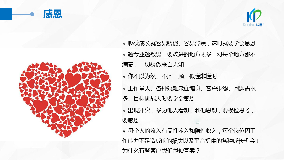 2018年9月,快普董事長(zhǎng)溫祝平先生發(fā)表《快普經(jīng)營(yíng)哲學(xué)2.0》,指出“以人為本、經(jīng)營(yíng)人心”的經(jīng)營(yíng)理念,強(qiáng)調(diào)進(jìn)一步建設(shè)“幸福企業(yè)文化”的重要性。