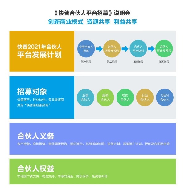 快普合伙人平臺將依托快普整合管理、專注細(xì)分行業(yè)與強(qiáng)大的技術(shù)平臺支持三大優(yōu)勢,面向各行各業(yè)招募合伙人,通過多種合作形式,建立“快普落地服務(wù)商”,幫助全國更多企業(yè)實(shí)現(xiàn)信息化轉(zhuǎn)型,提高企業(yè)的技術(shù)創(chuàng)新能力與品牌價(jià)值。