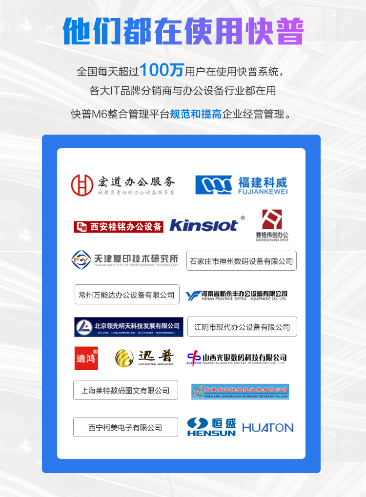 快普M6整合管理平臺整合了“協(xié)同辦公、客戶關(guān)系管理、供應(yīng)鏈管理、財務(wù)管理、運維服務(wù)管理、租賃抄表管理、生產(chǎn)管理、研發(fā)管理、人力資源管理、電子商務(wù)管理”等業(yè)務(wù)系統(tǒng),同時實現(xiàn)與移動互聯(lián)應(yīng)用、電話呼叫中心、郵件系統(tǒng)、手機短信、考勤機、手持終端等各種硬件設(shè)備無縫銜接。