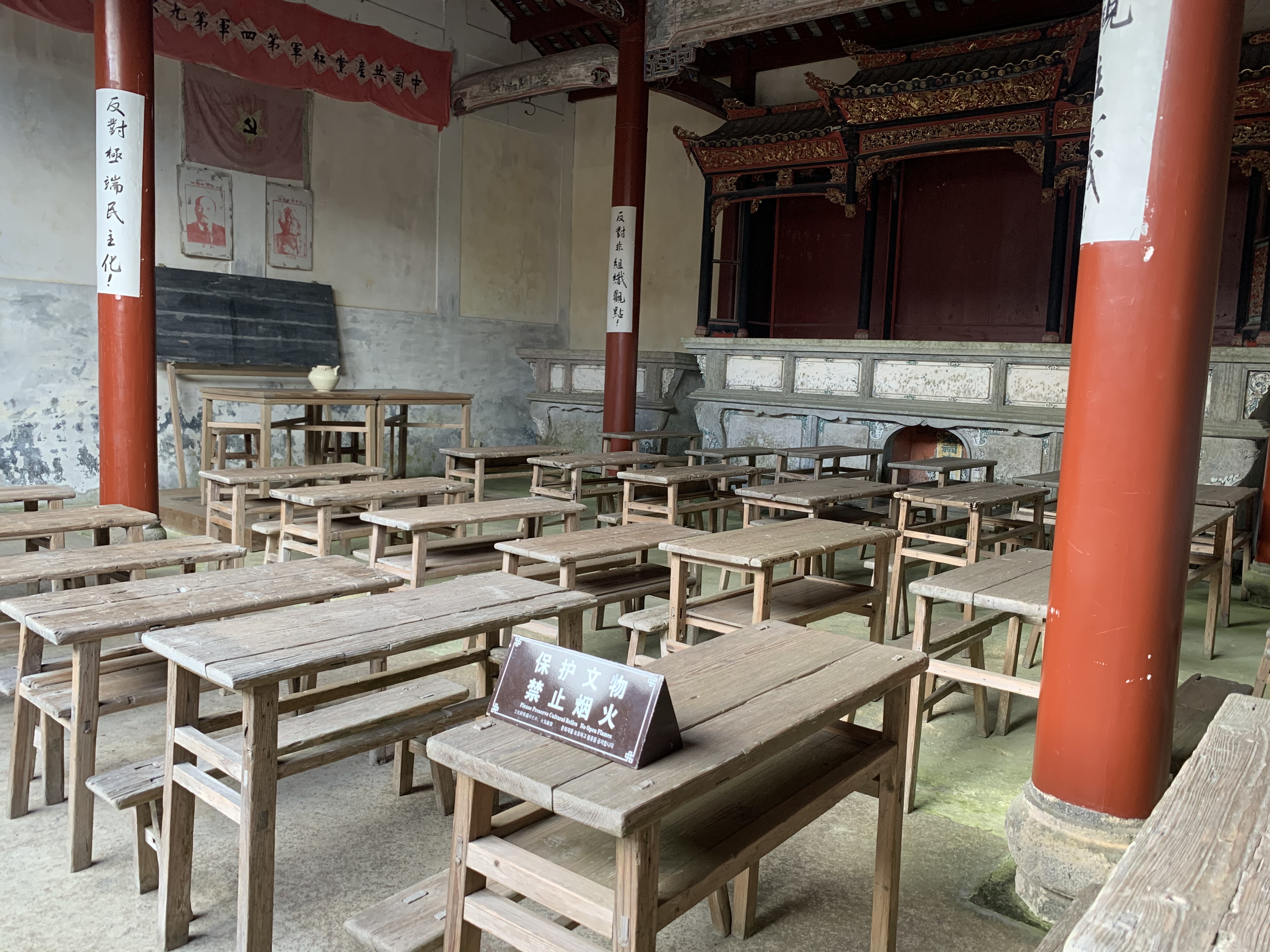 會(huì)址保持了當(dāng)年的陳設(shè),6列學(xué)生桌椅陳舊而整潔。會(huì)場(chǎng)正上方掛著“中國(guó)共產(chǎn)黨紅軍第九次代表大會(huì)”的橫幅,地板上的斑斑炭火印跡,瞬間把我們帶到了1929年那次非同尋常的會(huì)議。