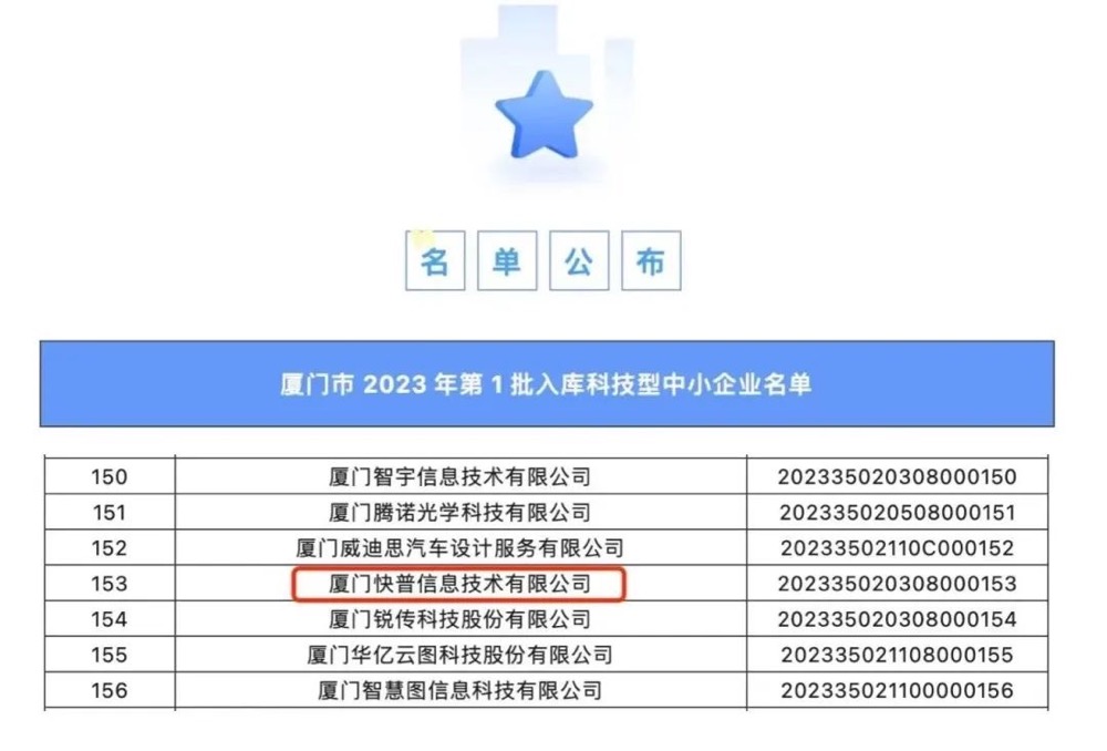 繼“廈門(mén)市創(chuàng)新型中小企業(yè)”認(rèn)定后,快普再傳捷報(bào)!近日,廈門(mén)市科技局發(fā)布了《2023年第一批入庫(kù)科技型中小企業(yè)名單》,快普赫然在列。該項(xiàng)評(píng)定意味著快普的技術(shù)成果、科技含量、創(chuàng)新能力等方面獲得了政府相關(guān)部門(mén)的充分肯定,同時(shí)也表明快普在科技創(chuàng)新、技術(shù)研發(fā)和知識(shí)產(chǎn)權(quán)保護(hù)方面邁上了一個(gè)新的臺(tái)階。