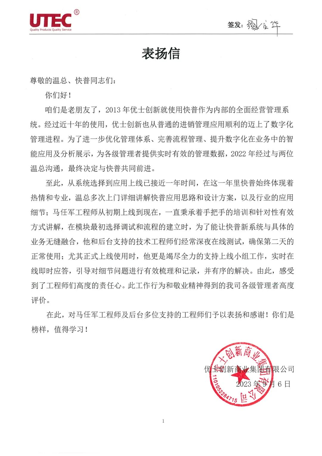 【簡(jiǎn)訊】老客戶(hù)優(yōu)士創(chuàng)新商業(yè)集團(tuán)有限公司(以下簡(jiǎn)稱(chēng)“優(yōu)士創(chuàng)新”)向我司發(fā)來(lái)感謝信,對(duì)快普的平臺(tái)、產(chǎn)品和團(tuán)隊(duì)服務(wù)給予了高度肯定,并特別對(duì)實(shí)施工程師馬任軍的專(zhuān)業(yè)、敬業(yè)及高度責(zé)心提出了表?yè)P(yáng)和贊賞。