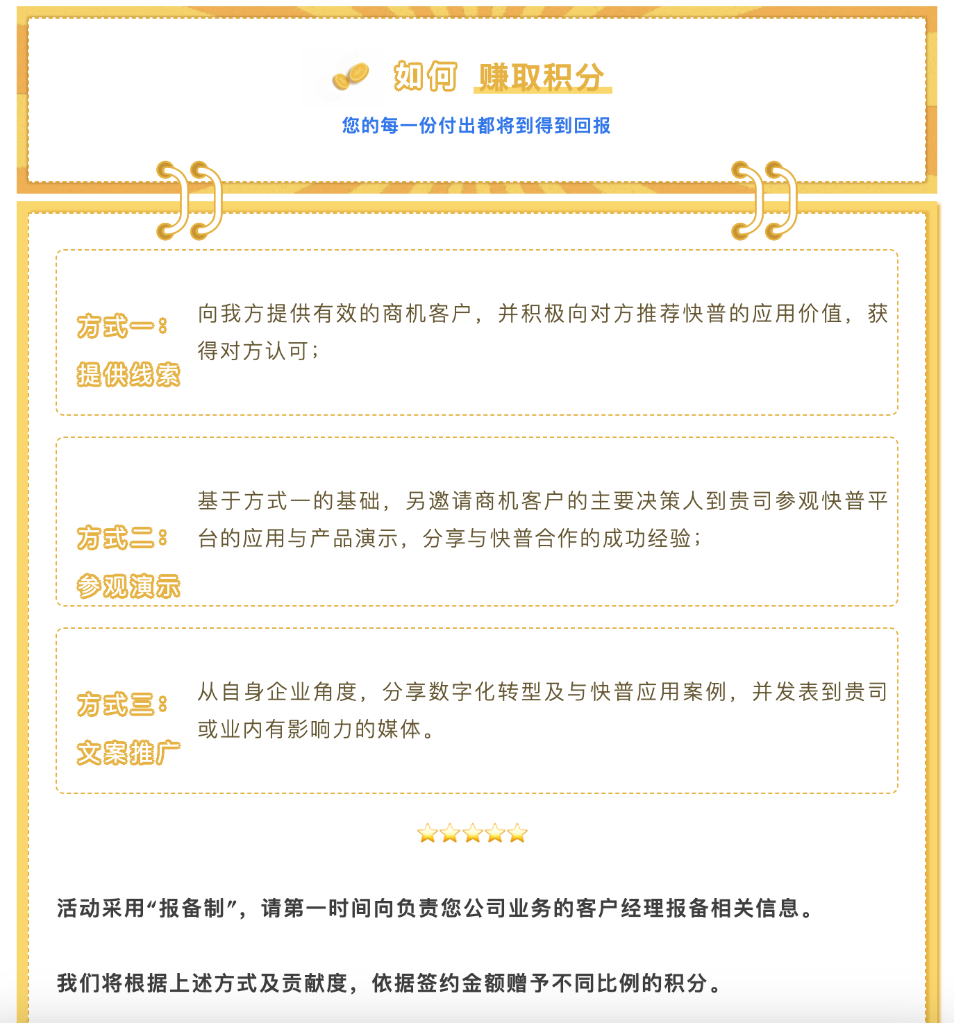 為進(jìn)一步回饋老用戶的貢獻(xiàn),現(xiàn)誠邀您參與“快普感恩回饋大行動(dòng)!”,與我們共享數(shù)字經(jīng)濟(jì)發(fā)展的紅利!通過主動(dòng)推薦、轉(zhuǎn)介紹客戶,您將獲取豐厚的積分返利,讓您的每一份付出都得到實(shí)質(zhì)性的回報(bào),人脈資源也可以獲得變現(xiàn)!