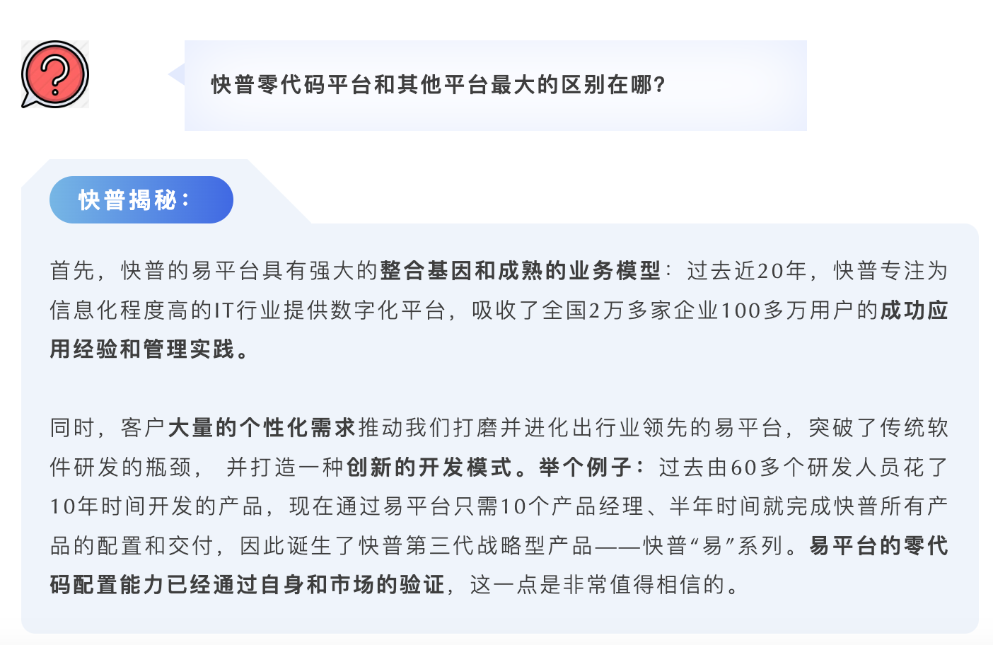 是的,我們可以很自信地說“快普零代碼平臺讓數(shù)字化轉(zhuǎn)型變得簡單、可行”。這個(gè)是面對數(shù)字化轉(zhuǎn)型的所有角色而言的,包括我們自身軟件研發(fā)、實(shí)施交付,以及合作伙伴、用戶等,易平臺在效率、成本、技術(shù)門檻和可擴(kuò)展性等方面來說都有著顛覆性的突破,是非常有意義和必要的基礎(chǔ)設(shè)施??偨Y(jié)說有下面幾點(diǎn):