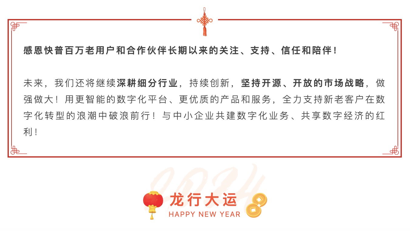 2023年是快普銳意改革、開拓進取的一年。面對機遇和挑戰(zhàn),我們苦練內(nèi)功,加大研發(fā)投入,積極擁抱市場,通過新一代“易”系列產(chǎn)品,幫助大量企業(yè)成功實現(xiàn)數(shù)字化的轉(zhuǎn)型升級,賦能企業(yè)邁向高質(zhì)量發(fā)展!同時,快普也實現(xiàn)了自身的逆勢增長,多項科技創(chuàng)新成果獲得了政府的嘉獎與社會各界的好評!2024年,我們不忘初心,堅守“數(shù)字化平臺服務商”的使命,1月份再創(chuàng)多項佳績!