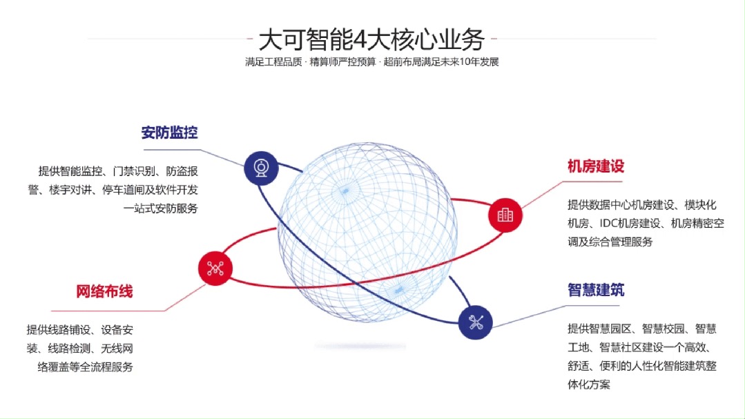 大可智能在行業(yè)內(nèi)率先提出“零分包”管理模式,并且自主要求每一個(gè)實(shí)施員工執(zhí)行公司制定的標(biāo)準(zhǔn)化施工規(guī)范,有效降低工程的成本,提高運(yùn)轉(zhuǎn)效率,為客戶(hù)提供更高效的咨詢(xún)、規(guī)劃、設(shè)計(jì)、施工、運(yùn)維一站式的解決方案。